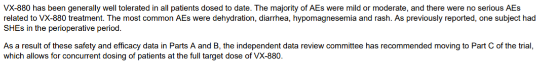 安全性:VX-880的副作用主要是輕度至重度,沒(méi)有發(fā)生嚴重副作用。VX-880治療表現出良好的安全性,且耐受性良好。大多數不良事件為輕度或中度,未發(fā)現與VX-880治療相關(guān)的嚴重不良事件。