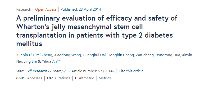 此外,解放軍總醫院內分泌科母義明教授、生物治療中心韓衛東教授等人也在Stem Cell Res Ther期刊上發(fā)表了一項單中心、隨機、雙盲、安慰劑對照試驗的結果,考察了臍帶間充質(zhì)干細胞治療2型糖尿病的有效性和安全性。
