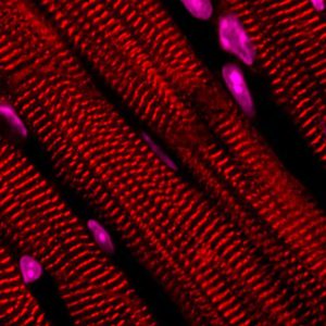 小鼠心臟的特寫(xiě)鏡頭,染色顯示有助于心肌細胞收縮的重要結構蛋白(紅色)。