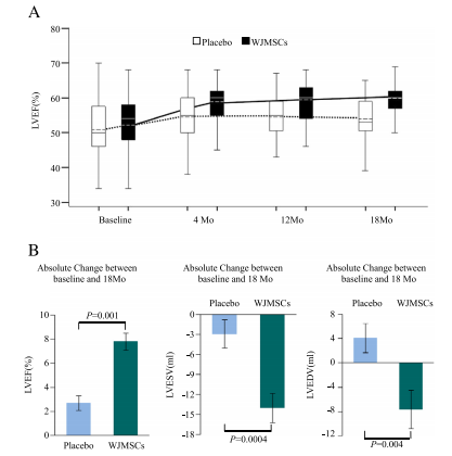在隨訪(fǎng)的第3、6和12個(gè)月時(shí)經(jīng)胸超聲心動(dòng)圖和心臟MRI評估,只有經(jīng)臍帶間充質(zhì)干細胞治療組顯示出左心室射血分數的顯著(zhù)改善。兩組間超聲心動(dòng)圖左心室射血分數從基線(xiàn)到第12個(gè)月的變化差異顯著(zhù)。