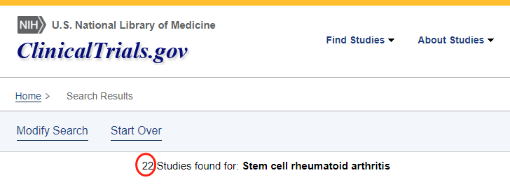 截止2023年1,在美國國立衛生研究院的最大臨床試驗注冊庫clinicaltrials.gov網(wǎng)站上注冊的有關(guān)干細胞治療類(lèi)風(fēng)濕關(guān)節炎的臨床研究項目有22項。