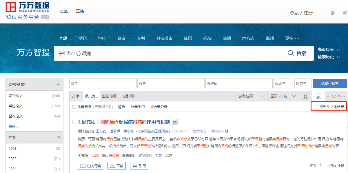 與此同時(shí),在萬(wàn)方數據通過(guò)“干細胞治療腎衰竭”關(guān)鍵詞檢索相關(guān)文獻,最終結果顯示有關(guān)干細胞治療腎病的基礎研究與臨床研究合計多達512條。