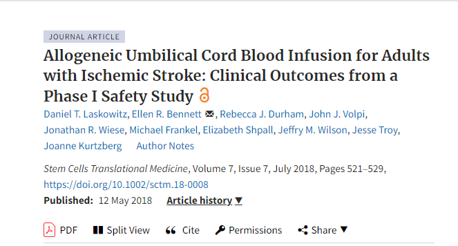 參考資料:Daniel T. Laskowitz, Ellen R. Bennett, Rebecca J. Durham, John J. Volpi, Jonathan R. Wiese, Michael Frankel, Elizabeth Shpall, Jeffry M. Wilson, Jesse Troy, Joanne Kurtzberg, Allogeneic Umbilical Cord Blood Infusion for Adults with Ischemic Stroke: Clinical Outcomes from a Phase I Safety Study,?Stem Cells Translational Medicine, Volume 7, Issue 7, July 2018, Pages 521–529,?https://doi.org/10.1002/sctm.18-0008