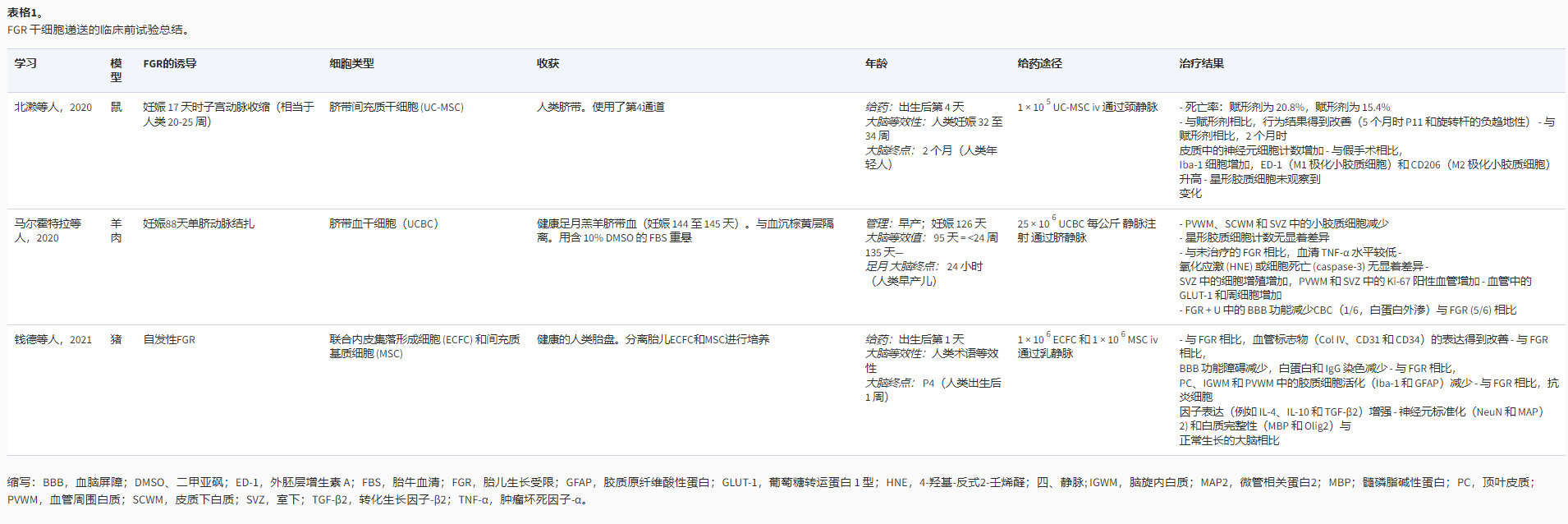 除了缺乏FGR嬰兒的臨床試驗外,臨床前動(dòng)物模型研究也有限,迄今為止發(fā)表的研究?jì)H有3篇(表1)。這些研究,包括FGR大鼠模型和2項大型動(dòng)物研究,顯示出有希望的神經(jīng)保護結果,報告了大腦干細胞治療后的多區室益處。