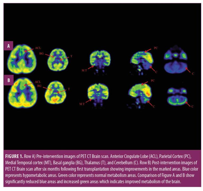 七個(gè)月后進(jìn)行了隨訪(fǎng),根據客觀(guān)量表和腦部PET CT掃描重新評估了患者干預后的臨床變化?;谒恼w改善,他接受了第二次BMMNC移植以進(jìn)一步促進(jìn)康復。鞘內施用大約5.12×108個(gè)存活率98%的BMMNC,發(fā)現CD34+細胞為0.014%。第二次移植后九個(gè)月進(jìn)行了另一次隨訪(fǎng)。