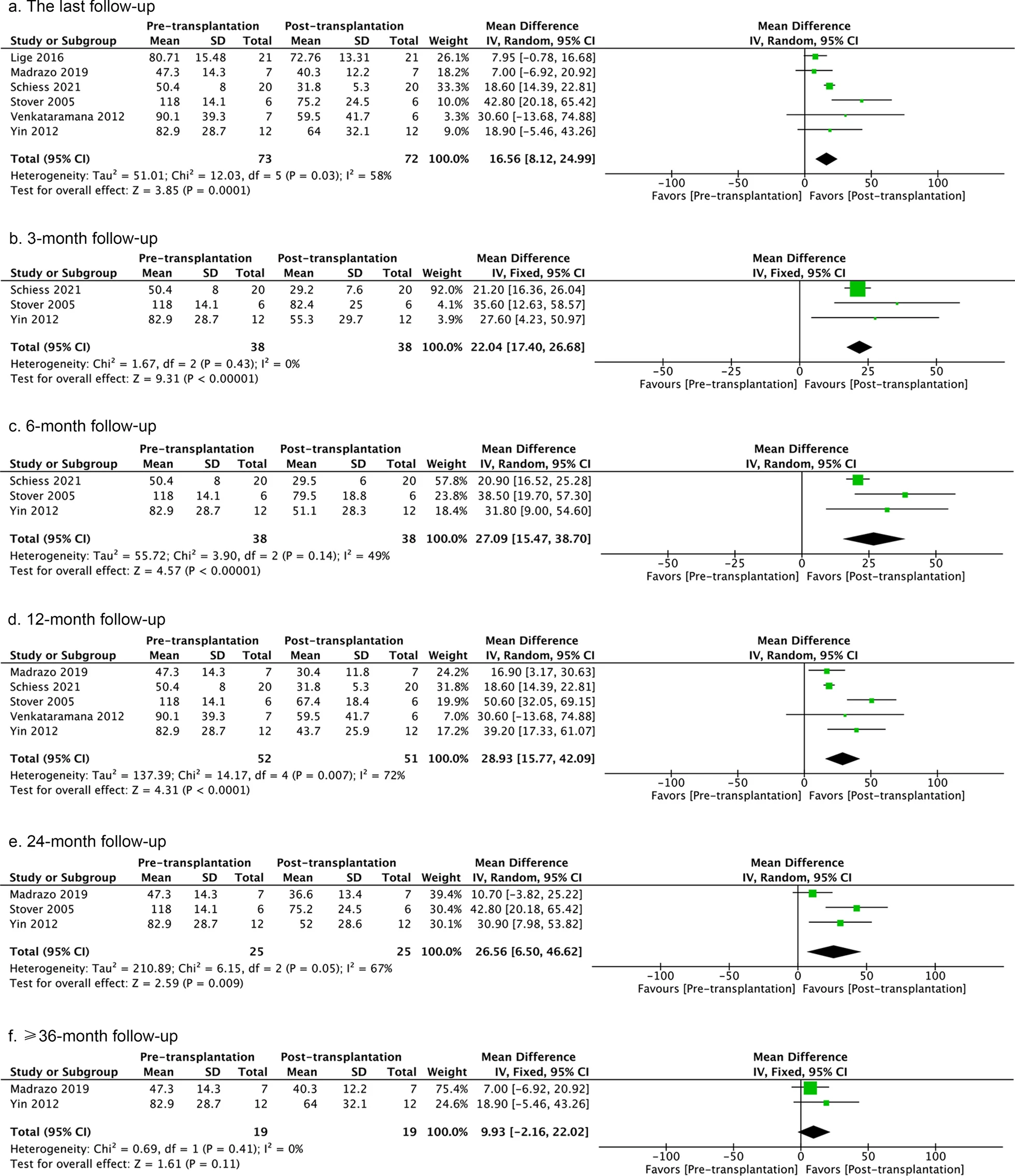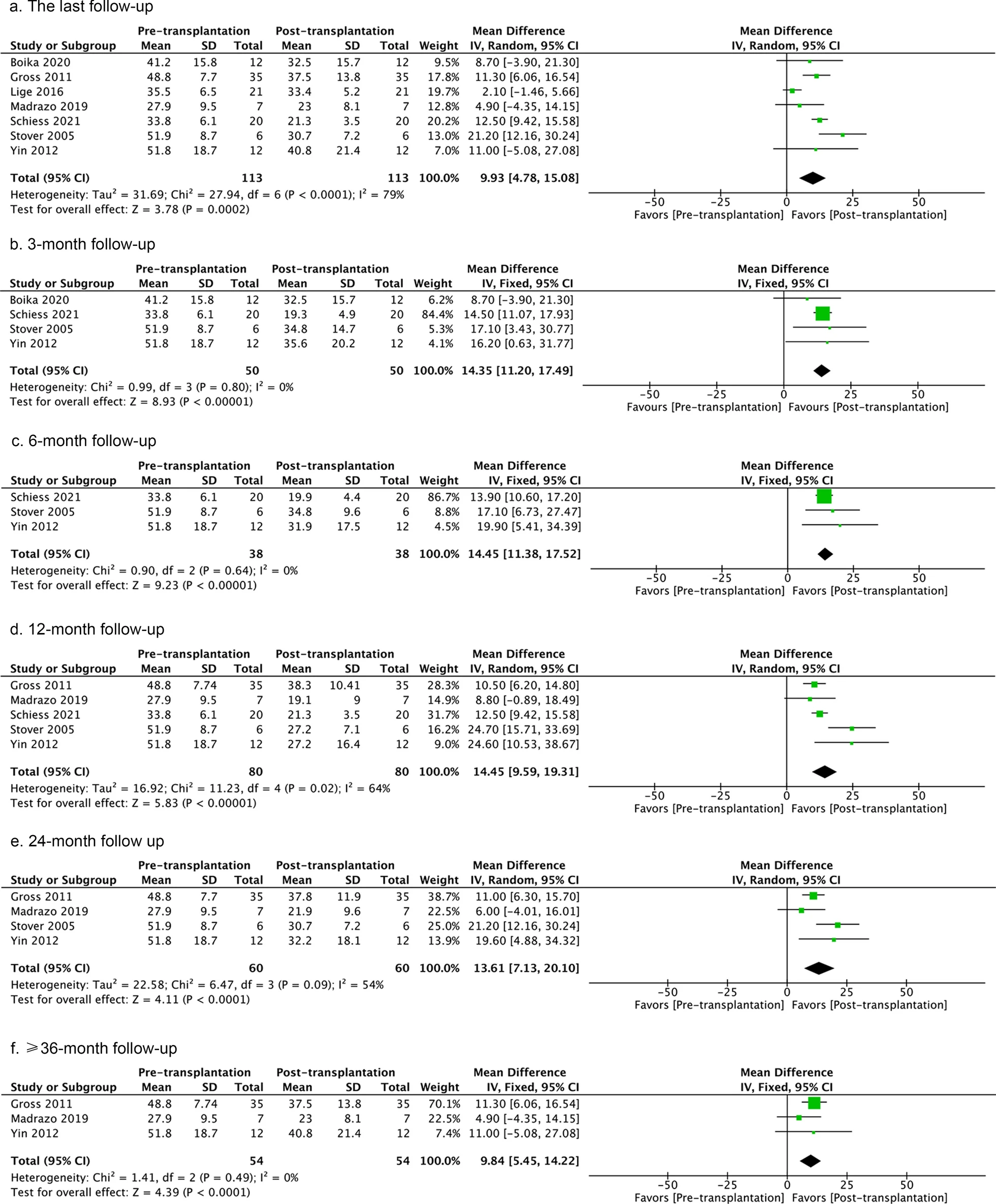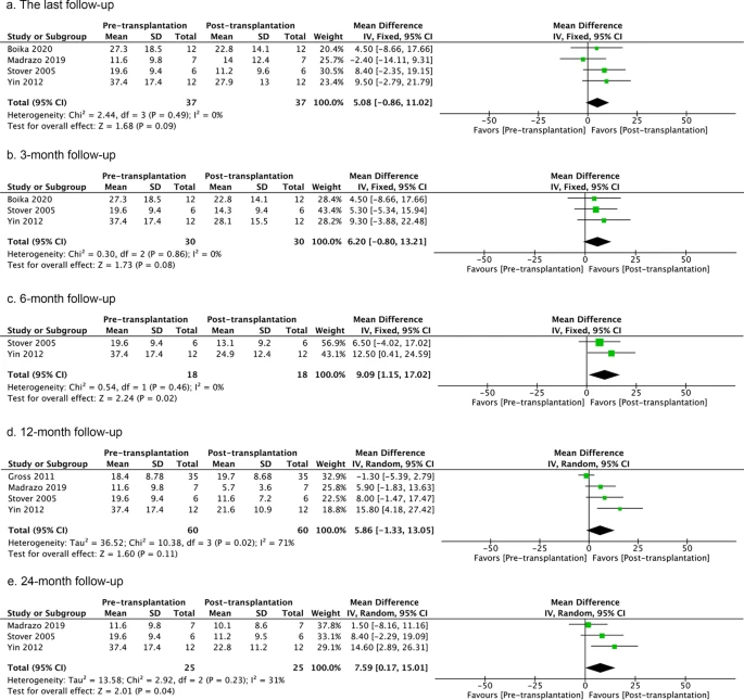 薈萃分析顯示,治療后與治療前相比,總體功能更好,但異質(zhì)性也很明顯。在最后一次隨訪(fǎng)以及3、6、12和24個(gè)月的隨訪(fǎng)中,同種細胞療法對 “關(guān)閉 “狀態(tài)下的UPDRS評分產(chǎn)生了有益的影響,但在≥36個(gè)月的隨訪(fǎng)中沒(méi)有這種影響(圖2)。然而,只有兩項研究報告了后者(圖2)。在3個(gè)月、6個(gè)月和≥36個(gè)月的隨訪(fǎng)分析中,”關(guān)閉 “狀態(tài)下的UPDRS評分顯示出相對的同質(zhì)性(圖2)。此外,細胞治療改善了12個(gè)月隨訪(fǎng)時(shí) “開(kāi)啟 “狀態(tài)下的UPDRS評分,但沒(méi)有改善最后一次隨訪(fǎng)或24個(gè)月、≥36個(gè)月隨訪(fǎng)時(shí)的評分(附加文件2:圖S2)。在12個(gè)月、24個(gè)月、≥36個(gè)月的隨訪(fǎng)中沒(méi)有明顯的異質(zhì)性,但在最后一次隨訪(fǎng)中卻有明顯的異質(zhì)性。這可能是由于不同的移植范例造成的。