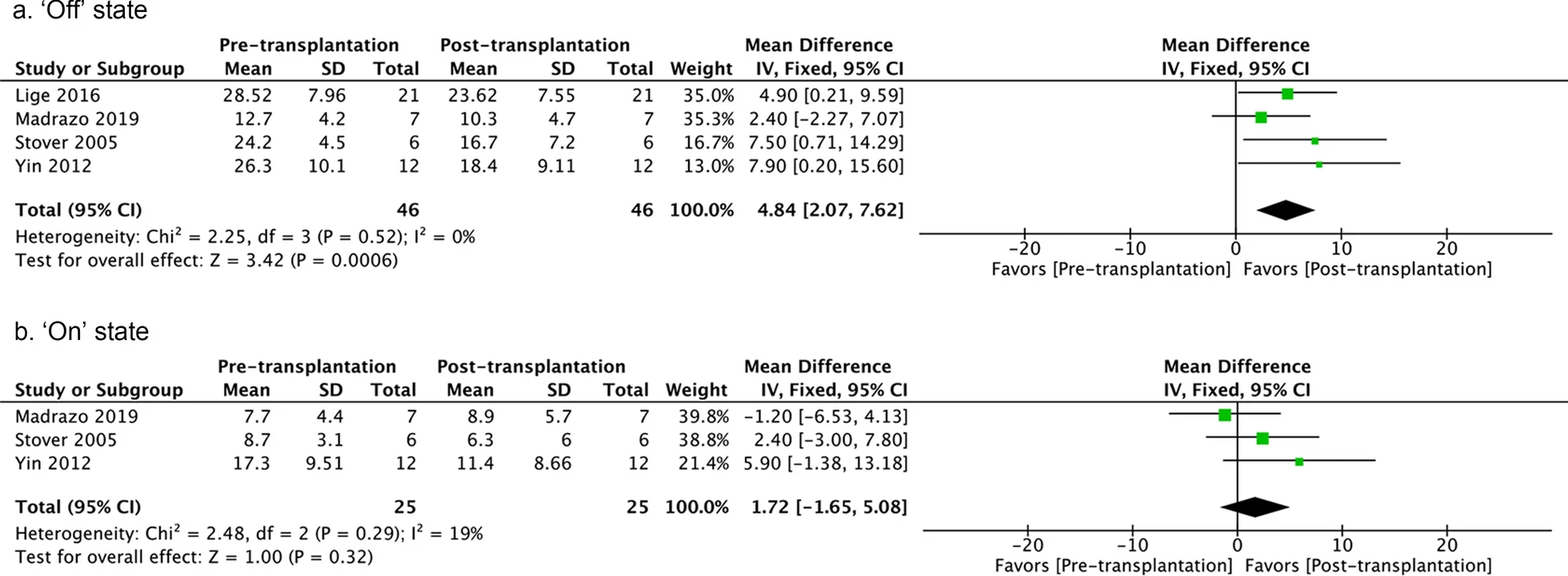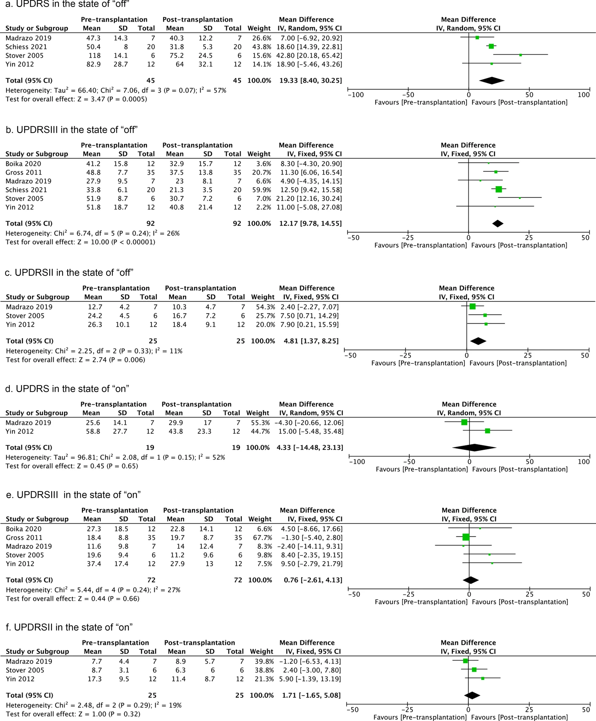 使用UPDRSII或Schwab和England評分評估ADL。四項研究檢查了最后一次隨訪(fǎng)時(shí)處于“關(guān)閉”狀態(tài)的UPDRSII評分。固定效應模型顯示同質(zhì)細胞治療后有更好的結果。三項研究評估了“開(kāi)啟”狀態(tài)下的 UPDRSII 評分(全部使用同種異體細胞),但沒(méi)有報告治療效果。沒(méi)有明顯的異質(zhì)性(圖5)。
