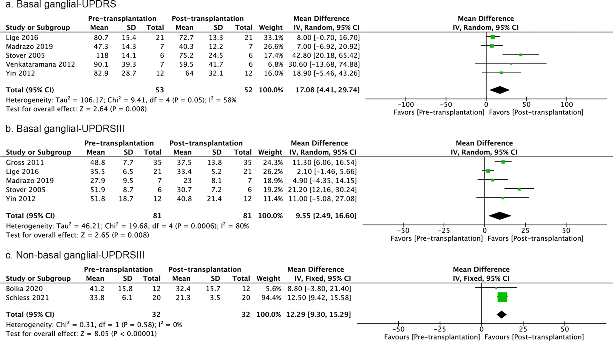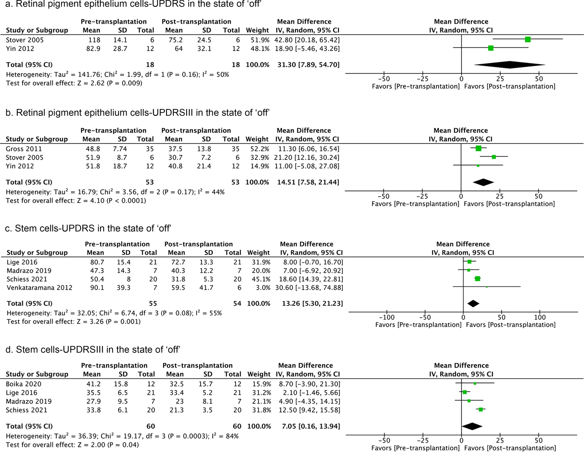 七項研究測量了干細胞療法對運動(dòng)癥狀的影響。使用隨機效應模型來(lái)比較研究最后一次隨訪(fǎng)時(shí)“關(guān)閉”狀態(tài)下治療前與治療后的UPDRSIII評分。細胞處理后薈萃分析得到了更好的結果,但異質(zhì)性很高(圖3)。