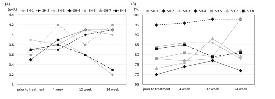 研究開(kāi)展了一項多機構臨床試驗(日本UMIN臨床試驗注冊中心:UMIN000022601),對7名非酒精性脂肪性肝炎或脂肪肝引起的肝硬化患者完成了治療和24周的隨訪(fǎng)。