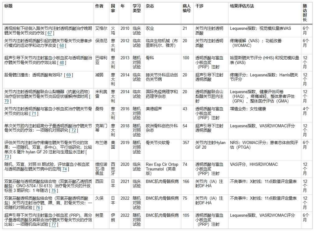 近年來(lái),研究HA療法治療HOA的臨床試驗逐漸引起眾多學(xué)者的關(guān)注(表4)。