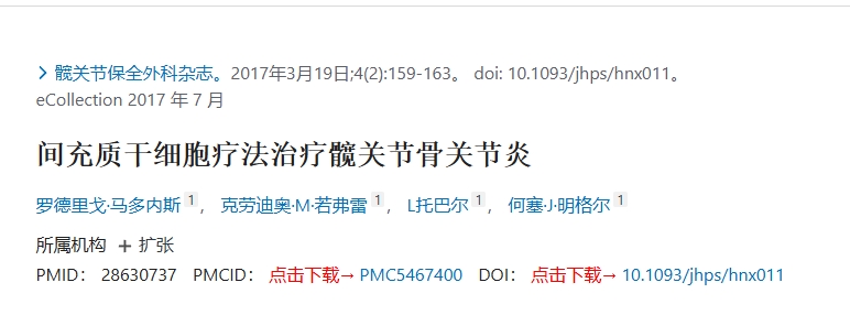 | 間充質(zhì)干細胞療法治療髖關(guān)節骨關(guān)節炎[109] | 馬多內斯 | 智利 | 2017 | 臨床試驗 | 髖關(guān)節保全外科雜志 | 10 | 關(guān)節內自體骨髓間充質(zhì)干細胞(BM-MSC)注射 | 哈里斯髖關(guān)節(HHS),視覺(jué)模擬(VAS),韋爾西安大略大學(xué)和麥克馬斯特大學(xué)骨關(guān)節炎指數(WOMAC) | 36個(gè)月 |