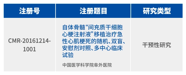 2016年年底,在我國醫學(xué)研究備案登記信息系統中,干細胞臨床研究項目《自體骨髓“間充質(zhì)干細胞心梗注射液”移植治療急性心肌梗死的隨機、雙盲、安慰劑對照、多中心臨床試驗》獲得國家備案,得到了國家干細胞臨床研究專(zhuān)家委員會(huì )的集體認可。