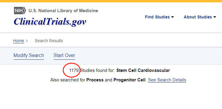 截止2022年12月,在美國國立衛生研究院的最大臨床試驗注冊庫clinicaltrials.gov網(wǎng)站上注冊的有關(guān)干細胞治療心血管疾病的臨床研究項目有1179項。