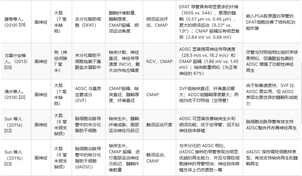 局限性與未來(lái)方向:本綜述的主要局限在于納入的研究絕大多數(除一項外)都是在動(dòng)物模型中評估ADSC/dADSC對周?chē)窠?jīng)再生的效果。