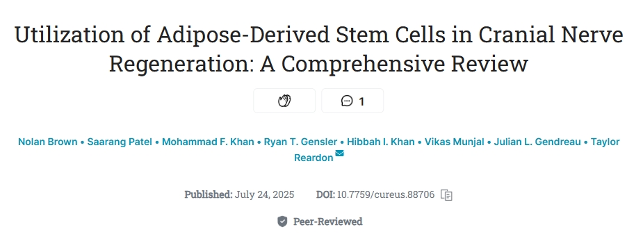 [1]:Brown N, Patel S, Khan M F, et al. (July 24, 2025) Utilization of Adipose-Derived Stem Cells in Cranial Nerve Regeneration: A Comprehensive Review. Cureus 17(7): e88706. doi:10.7759/cureus.88706