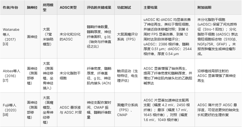 結論:脂肪干細胞(ADSC)作為神經(jīng)再生的潛在治療手段,其價(jià)值在長(cháng)期研究中得到認可。本綜述綜合現有證據(盡管以動(dòng)物研究為主)表明,ADSC治療能有效促進(jìn)顱神經(jīng)的結構和功能恢復。