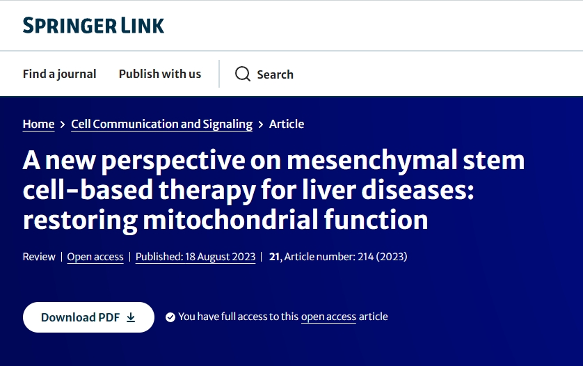 參考資料:Cen, Y., Lou, G., Qi, J. et al. A new perspective on mesenchymal stem cell-based therapy for liver diseases: restoring mitochondrial function. Cell Commun Signal 21, 214 (2023). https://doi.org/10.1186/s12964-023-01230-0