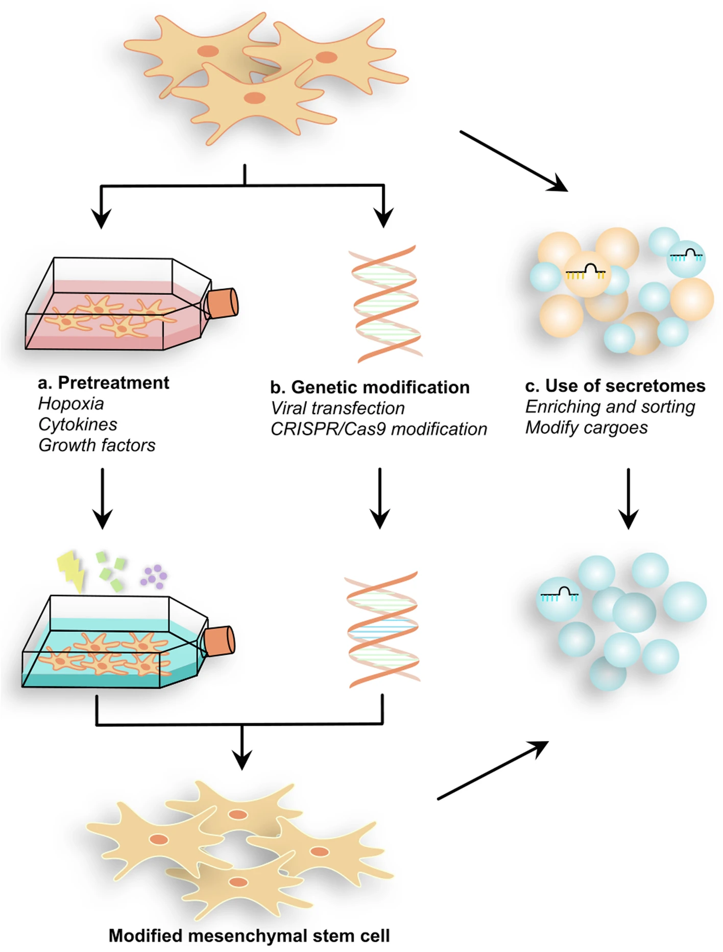 除了我們之前關(guān)于改良間充質(zhì)干細胞有益于肝纖維化和肝癌的研究外,改良間充質(zhì)干細胞療法在治療其他肝病方面也被認為是有效的。目前,出現了更精確的修飾方法來(lái)增強間充質(zhì)干細胞的作用。這些策略可能涉及間充質(zhì)干細胞的啟動(dòng)、間充質(zhì)干細胞的基因修飾或間充質(zhì)干細胞分泌物的使用(圖2)。