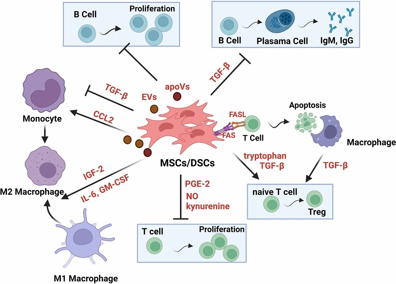 • 免疫調節功能:間充質(zhì)干細胞不表達主要組織相容性復合體(MHC)II類(lèi)分子,因此具有低免疫原性,可以抑制T淋巴細胞、B淋巴細胞和自然殺傷細胞的增殖反應,從而減少免疫排斥反應。這一特性使得間充質(zhì)干細胞在異體甚至異種移植中具有優(yōu)勢。