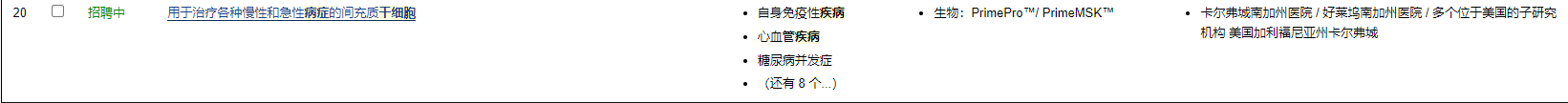除此之外,在ClinicalTrail上注冊的干細胞治療AD臨床研究還有20余項,其中3項由中國機構注冊,分別是華南干細胞與再生醫學(xué)研究中心(合作單位:中山大學(xué)附屬第三醫院)和中國軍事醫學(xué)科學(xué)院附屬醫院(合作單位:北京大學(xué)第三醫院)及上海交通大學(xué)醫學(xué)院附屬瑞金醫院,均使用的是異體臍帶MSCs,其余項目主要為美國和韓國機構。具體信息見(jiàn)表1。