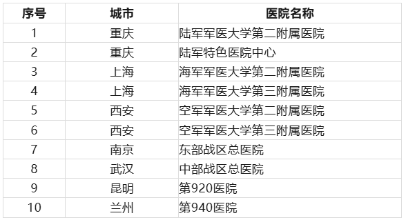 | 13 | 重慶 | 陸軍軍醫大學(xué)第二附屬醫院 |