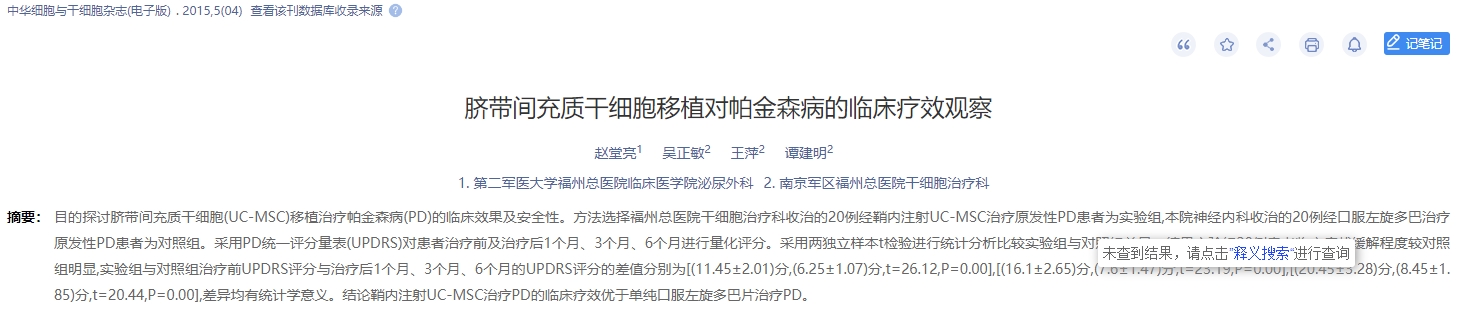 2015年,第二軍醫大學(xué)福州總醫院發(fā)表了一篇臍帶間充質(zhì)干細胞移植對帕金森病的臨床療效觀(guān)察的文章。