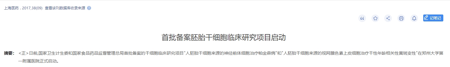 日前,國家衛生計生委和國家食品藥品監督管理總局首批備案的干細胞臨床研究項目”人胚胎干細胞來(lái)源的神經(jīng)前體細胞治療帕金森病”和”人胚胎干細胞來(lái)源的視網(wǎng)膜色素上皮細胞治療干性年齡相關(guān)性黃斑變性”在鄭州大學(xué)第一附屬醫院正式啟動(dòng)。