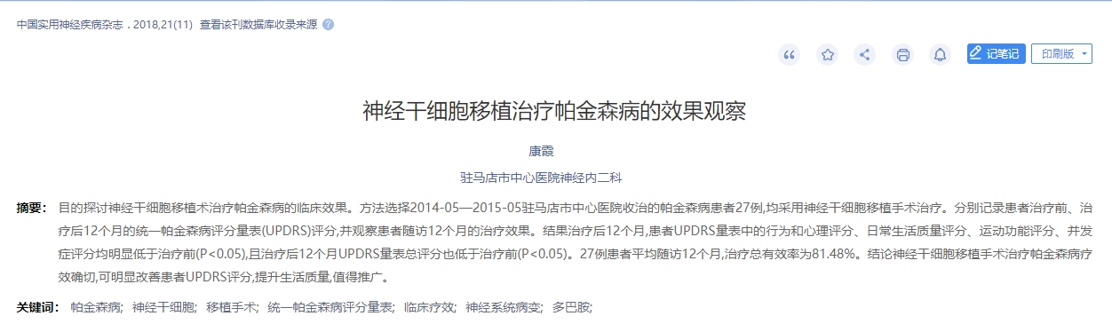 2018年,河南駐馬店市中心醫院神經(jīng)內二科發(fā)表了神經(jīng)干細胞移植治療帕金森病的效果觀(guān)察的文章。