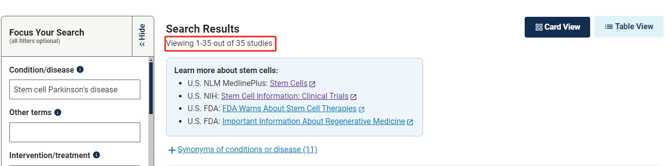 截止2024年2月,在美國國立衛生研究院的最大臨床試驗注冊庫clinicaltrials.gov網(wǎng)站上注冊的有關(guān)干細胞治療帕金森病的臨床研究項目有35項。