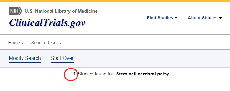 截止2022年12,在美國國立衛生研究院的最大臨床試驗注冊庫clinicaltrials.gov網(wǎng)站上注冊的有關(guān)干細胞治療腦癱的臨床研究項目有29項。