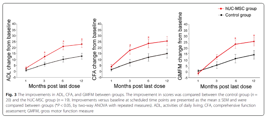 40例符合條件的患者隨機分為hUC-MSC(人臍帶間充質(zhì)干細胞)治療組和對照組。除康復治療,hUC-MSC組接受4次靜脈輸注hUC-MSCs,對照組則接受安慰劑。通過(guò)12個(gè)月的隨訪(fǎng)進(jìn)行安全性評估(通過(guò)不良事件(AEs) )和有效性評估(通過(guò)日常生活活動(dòng)能力(ADL)量表、綜合健康功能評估(CFA)和粗大運動(dòng)功能評估量表(GMFM) )。