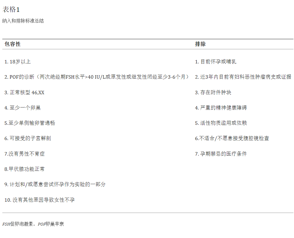 根據以下納入標準招募患者進(jìn)入研究:年齡超過(guò)18歲,原發(fā)性或繼發(fā)性閉經(jīng)至少6個(gè)月,至少兩個(gè)絕經(jīng)期促卵泡激素 (FSH) 水平 (> 40IU/L),正常核型46,XX,并且存在至少一個(gè)卵巢。