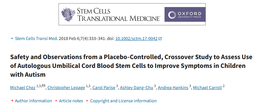 2、Chez M, Lepage C, Parise C, Dang-Chu A, Hankins A, Carroll M. Safety and Observations from a Placebo-Controlled, Crossover Study to Assess Use of Autologous Umbilical Cord Blood Stem Cells to Improve Symptoms in Children with Autism. Stem Cells Transl Med. 2018 Apr;7(4):333-341. doi: 10.1002/sctm.17-0042. Epub 2018 Feb 6. PMID: 29405603; PMCID: PMC5866927.