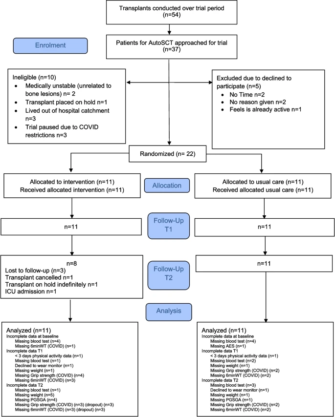 參與者被隨機分配接受每周兩次、監督的定制運動(dòng)和每?jì)芍芤淮蔚碾娫?huà)營(yíng)養教育,最長(cháng)持續8周,之后接受自體干細胞移植 (autoSCT??) 或常規護理 (?n=11)??。盲法評估分別在基線(xiàn) (T0)、移植前 (T1) 和移植后4周 (T2) 進(jìn)行。