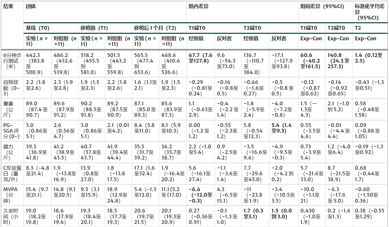 總結:研究顯示預康復安全性良好,僅出現輕微不良事件(如皮膚刺激、肌肉酸痛),自體干細胞移植后常見(jiàn)并發(fā)癥為腹瀉和發(fā)熱性中性粒細胞減少,5 例患者病情進(jìn)展或復發(fā)。主要療效指標(6分鐘步行距離)表明,實(shí)驗組較對照組有顯著(zhù)改善,效應量超過(guò)臨床意義閾值,提示干預措施對患者運動(dòng)能力有積極影響。