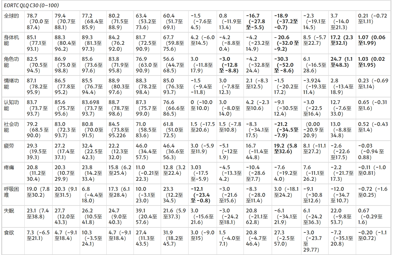 在T2期,實(shí)驗組在EORTC-QLQ C30量表的身體功能和角色功能子量表上顯示出顯著(zhù)優(yōu)于對照組的組間差異。其他次要結局未達到統計學(xué)顯著(zhù)。然而,T2期實(shí)驗組在以下方面表現出中到大效應優(yōu)勢:體重增加、認知功能改善、社會(huì )功能、區分生活中重要事項的能力,以及呼吸困難減輕和胃腸道癥狀緩解。
