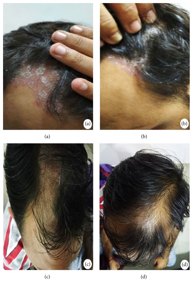 一位患有尋常型銀屑病2年的38歲男性患者來(lái)我中心就診。對患者的初步檢查顯示,包括耳后區域在內的整個(gè)頭皮上都有許多帶有許多銀色鱗屑的紅斑。銀屑病頭皮嚴重程度指數 (PSSI) 評估疾病的嚴重程度為28,該指數通過(guò)結合嚴重程度(紅斑、硬結和脫屑)和受影響區域百分比的標準方法計算。