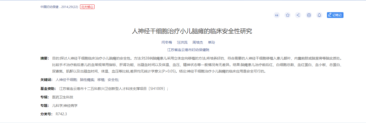 2014年,江蘇省連云港市婦幼保健院進(jìn)行了一項人神經(jīng)干細胞治療小兒腦癱的臨床安全性研究。結果表明:神經(jīng)干細胞治療小兒腦癱的臨床應用是安全可行的。