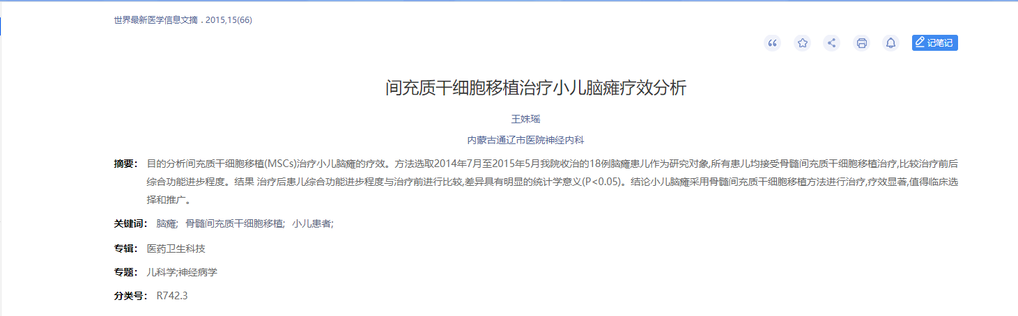 2015年,內蒙古通遼市醫院神經(jīng)內科在世界最新醫學(xué)信息文摘發(fā)表了一篇間充質(zhì)干細胞移植治療小兒腦癱療效分析的文章,結果表明小兒腦癱采用骨髓間充質(zhì)干細胞移植方法進(jìn)行治療,療效顯著(zhù),值得臨床選擇和推廣。