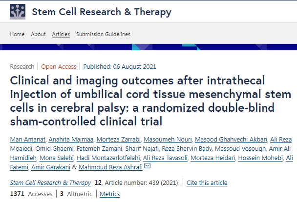 2021年,一項有關(guān)鞘內注射臍帶間充質(zhì)干細胞(UCT-MSC)治療在腦癱的臨床試驗表明,臍帶間充質(zhì)干細胞移植是安全的,甚至有希望改善臨床和影像學(xué)結果。