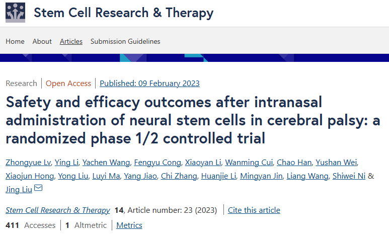 2023年2月9日,大連醫科大學(xué)附一院劉晶教授等在Stem Cell Research& Therapy上發(fā)表論文《Safety and efficacy outcomes after intranasal administration of neural stem cells in cerebral palsy: a randomized phase 1/2 controlled trial》(腦癱患者鼻內注射神經(jīng)干細胞后的安全性和療效:一項隨機1/2期對照試驗)。