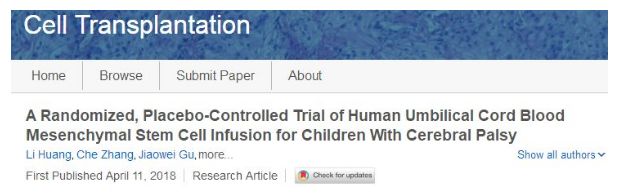 2018年,西安交通大學(xué)醫學(xué)院神經(jīng)生物學(xué)研究所呂海俠教授在細胞移植期刊(Cell Transplantation)上發(fā)表了一篇研究成果。通過(guò)隨機、安慰劑對照的臍帶血間充質(zhì)干細胞輸注治療腦癱患兒,結果顯示臍帶血治療組患兒的癥狀改善程度顯著(zhù)優(yōu)于對照組。證實(shí)臍帶間充質(zhì)干細胞治療腦癱安全且效果顯著(zhù)。