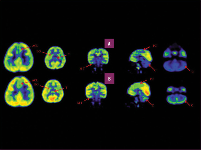 前扣帶回 (ACL)、頂葉皮層 (PC)、內側顳葉皮層 (MT)、基底神經(jīng)節 (BG)、丘腦 (T) 和小腦 (C)。B 行)第一次移植后6個(gè)月后PETCT腦部掃描的干預后圖像顯示標記區域有所改善。藍色代表代謝減退區域。綠色代表正常的新陳代謝區域。圖A和B的比較顯示藍色區域顯著(zhù)減少,綠色區域增加,這表明大腦的新陳代謝得到改善。