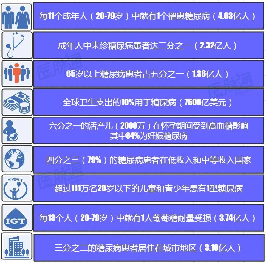 國際糖尿病聯(lián)合會(huì )發(fā)布第9版的《全球糖尿病地圖 (IDF Diabetes Atlas)》,對全球糖尿病的當前形勢以及未來(lái)的發(fā)展趨勢進(jìn)行了系統的分析與預測。目前全球范圍內估計在20歲~79歲人群中有4.63億人患有糖尿病,絕大多數為II型糖尿病。