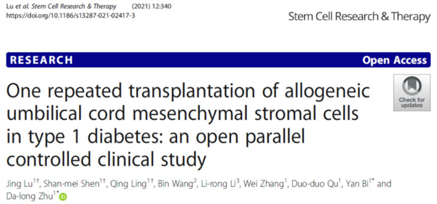 2021年,南京市鼓樓醫院內分泌科朱大龍教授團隊,在Stem Cell Research & Therapy發(fā)表了《臍帶間充質(zhì)干細胞在1型糖尿病重復移植:一項開(kāi)放、非隨機、平行對照臨床試驗》[3]。
