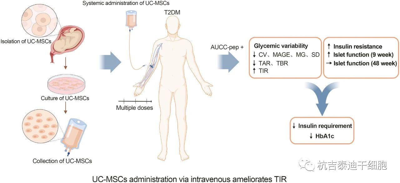 該篇文章發(fā)布在《干細胞轉化醫學(xué)》雜志上,數據結果表明顯示,通過(guò)靜脈輸注給予UC-MSC顯著(zhù)增加TIR,并且具有較高AUCC-pep的男性患者更有可能從UC-MSC治療中受益。UC-MSCs移植可能是中國成人T2DM的一種潛在治療方法。