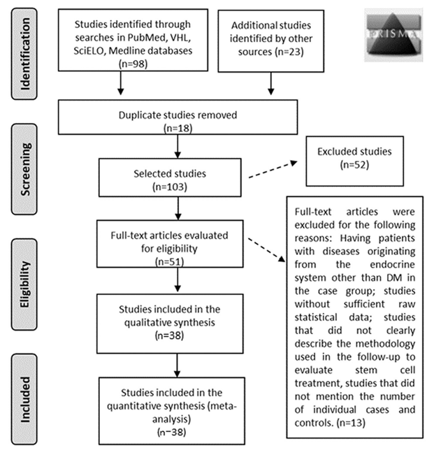 來(lái)自PubMed、SciELO、BVS、Medline等數據庫,38篇原始文獻,包括647例對照病例和654例治療病例,對1型糖尿病和2型糖尿病患者進(jìn)行3、6和12個(gè)月的隨訪(fǎng)(圖1)。通過(guò)比較治療前后的空腹血糖和C肽水平等實(shí)驗室指標,驗證干細胞治療的有效性。