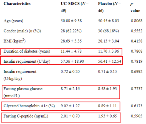 在37名接受臍帶間充質(zhì)干細胞治療的患者中,有5名患者在干細胞治療后 (12±7.6周達到無(wú)胰島素水平,并在37.2±15.2周內也沒(méi)有再次使用。相比之下,安慰劑組的患者則必須依賴(lài)胰島素治療。