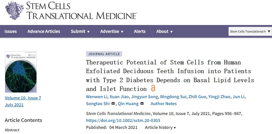 參考資料:Wenwen Li, Xuan Jiao, Jingyun Song, Bingdong Sui, Zhili Guo, Yingji Zhao, Jun Li, Songtao Shi, Qin Huang, Therapeutic Potential of Stem Cells from Human Exfoliated Deciduous Teeth Infusion into Patients with Type 2 Diabetes Depends on Basal Lipid Levels and Islet Function, Stem Cells Translational Medicine, Volume 10, Issue 7, July 2021, Pages 956–967, https://doi.org/10.1002/sctm.20-0303
