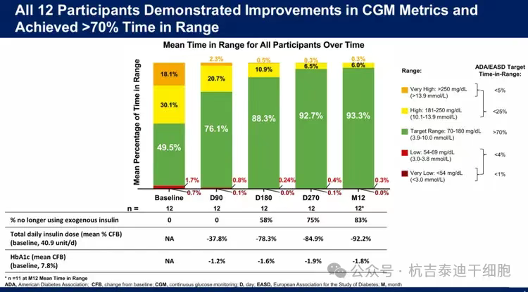 在針對嚴重1型糖尿病伴低血糖無(wú)知覺(jué)患者的試驗中,83%(10/12)的患者一年內完全停用胰島素,所有患者HbA1c降至正常(<7%)、血糖達標時(shí)間(TIR)超93%,且嚴重低血糖事件從第90天起清零,首次實(shí)現接近“功能性治愈”的療效。
